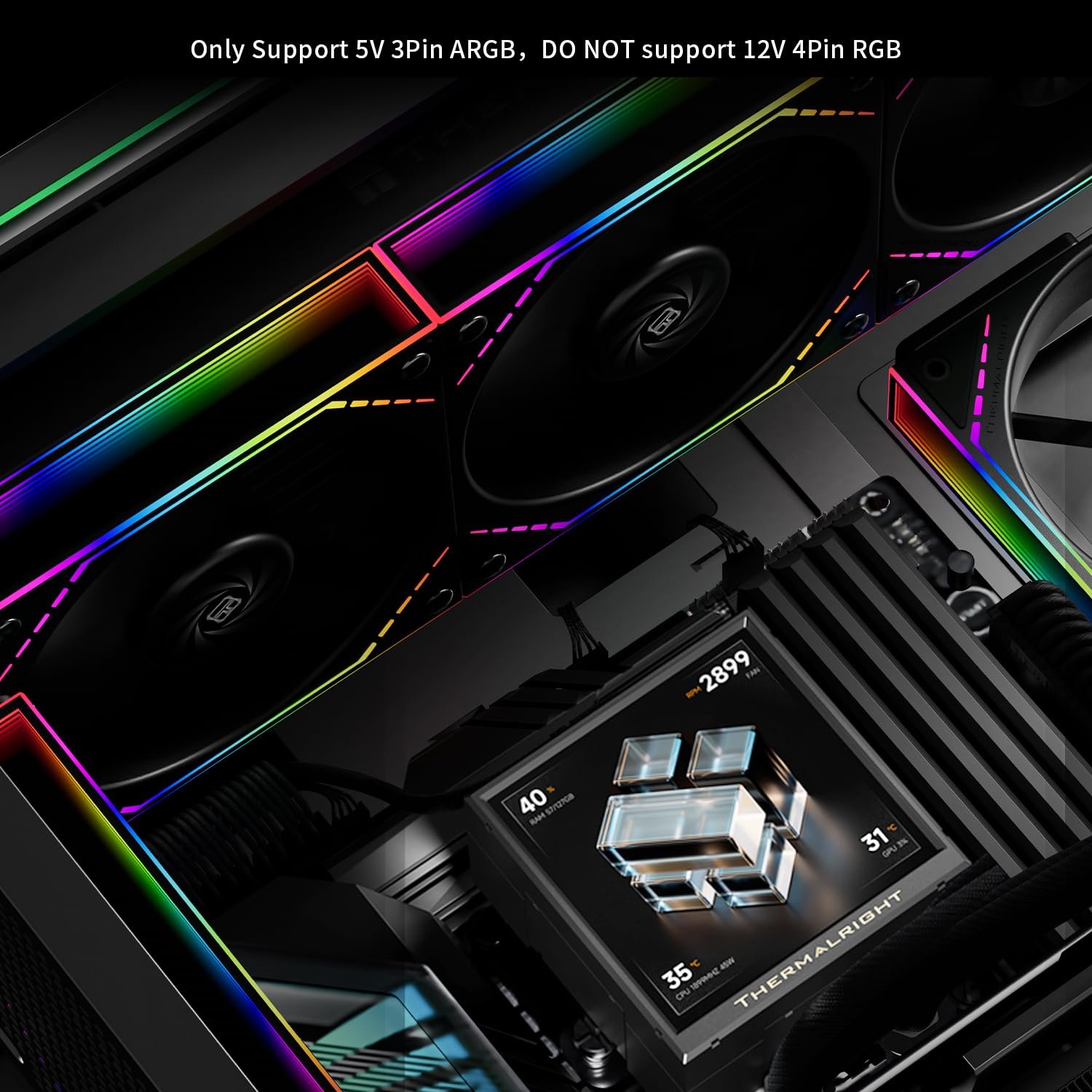 - Interfaz de Alimentación: 4-pin PWM para el ventilador y 5V 3-pin ARGB para la iluminación.