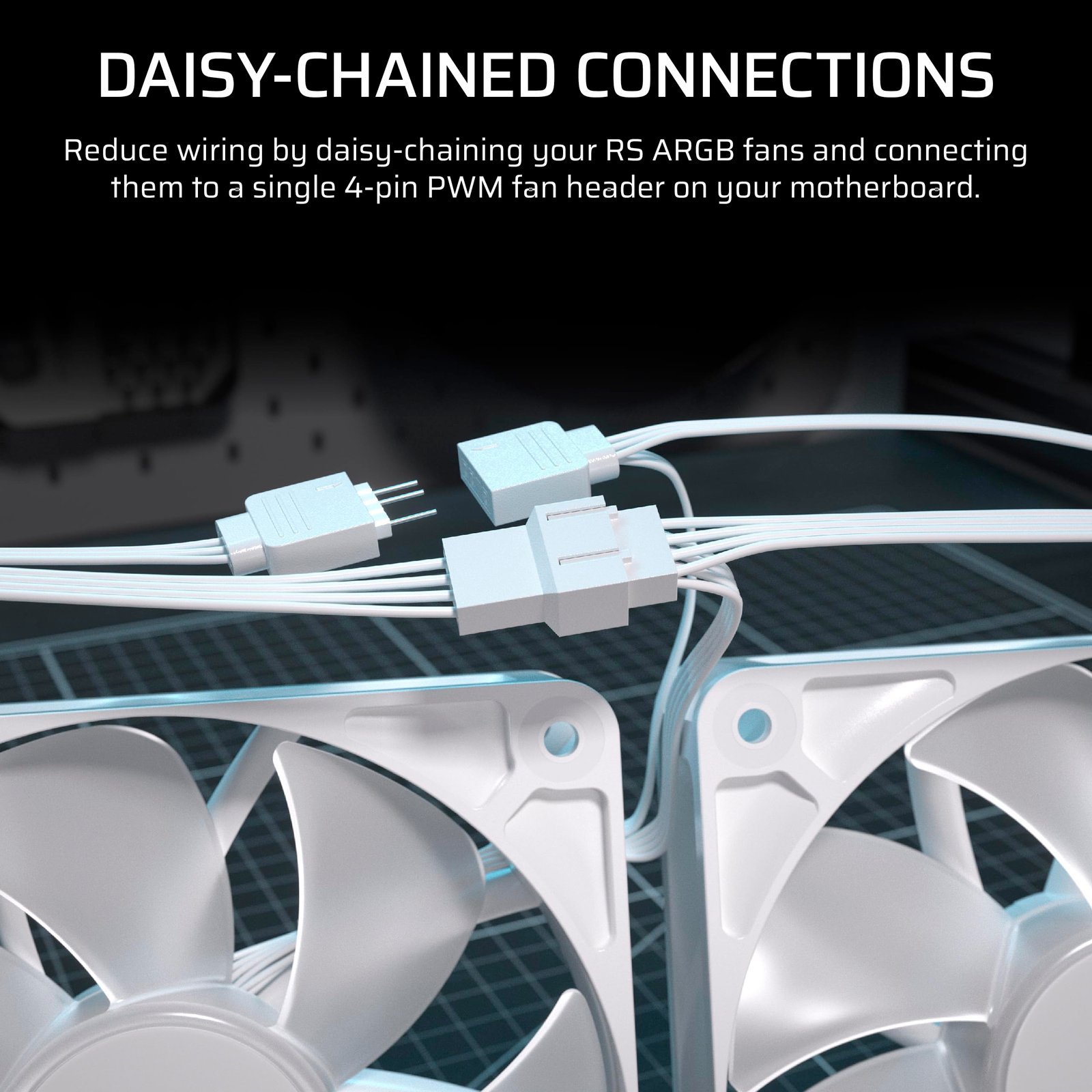 - Conexiones Eficientes: Reduce el desorden en tu sistema encadenando los ventiladores y conectándolos a un solo cabezal de ventilador PWM de 4 pines y un cabezal ARGB de +5 V.