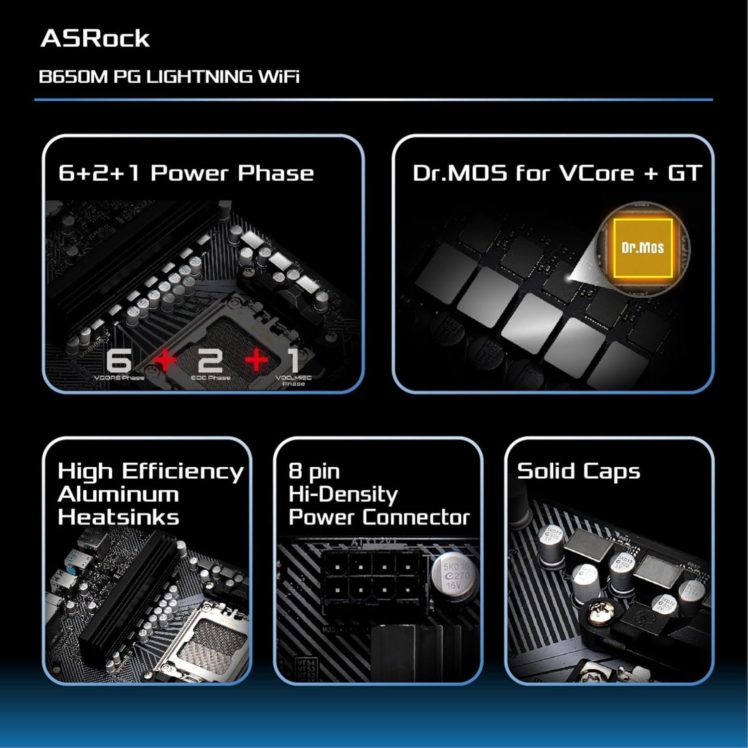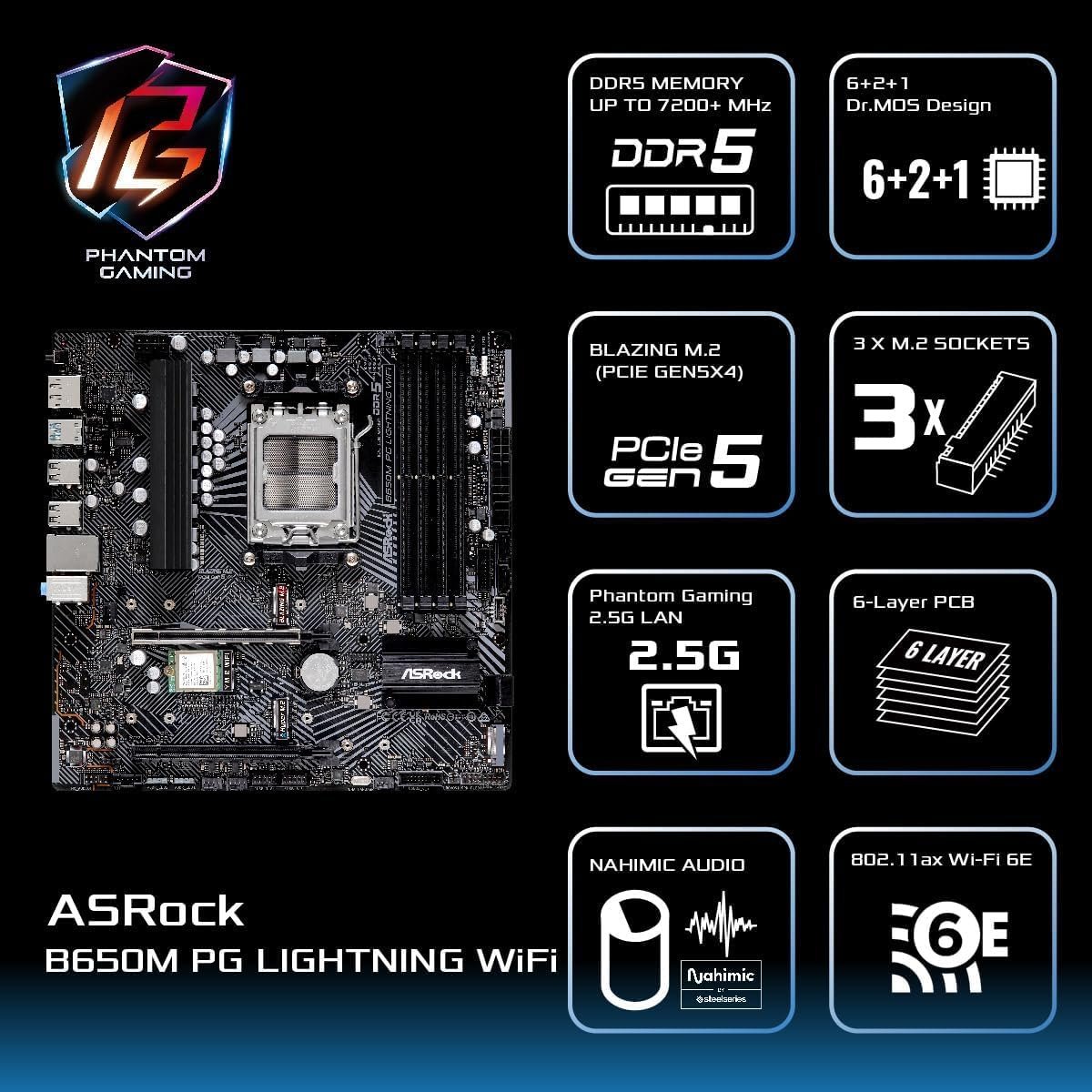 Mejora tu experiencia de juego y rendimiento con la placa madre B650M PG LIGHTNING WIFI, diseñada especialmente para procesadores AMD Socket AM5. Esta placa madre mATX es la elección ideal para gamers y entusiastas que buscan velocidad, conectividad y un sonido envolvente en cada partida.