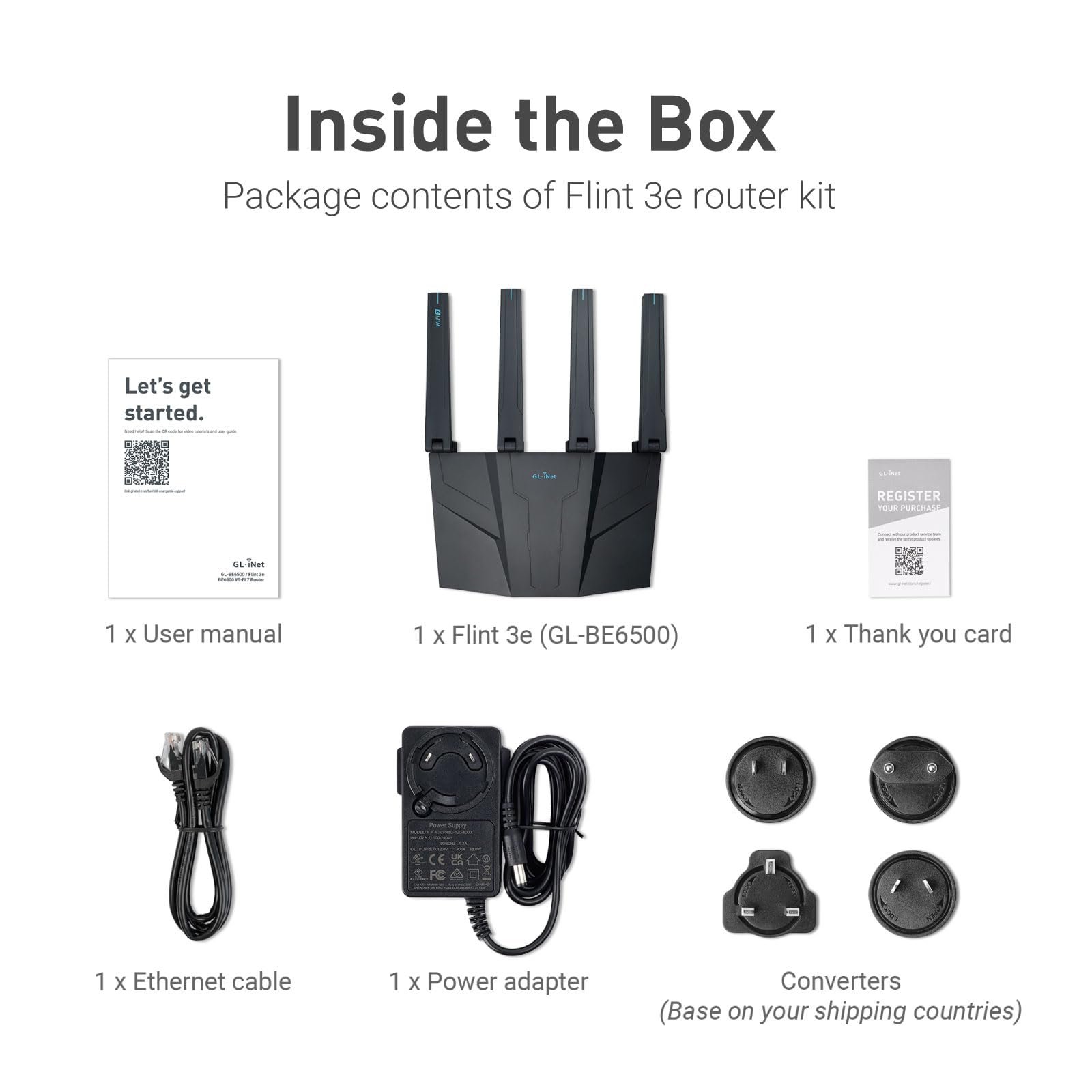 Router WiFi 7 GL.iNet GL-BE6500 Flint 3e Negro, 5 Puertos 2.5G, Conexión Inalámbrica y por Cable